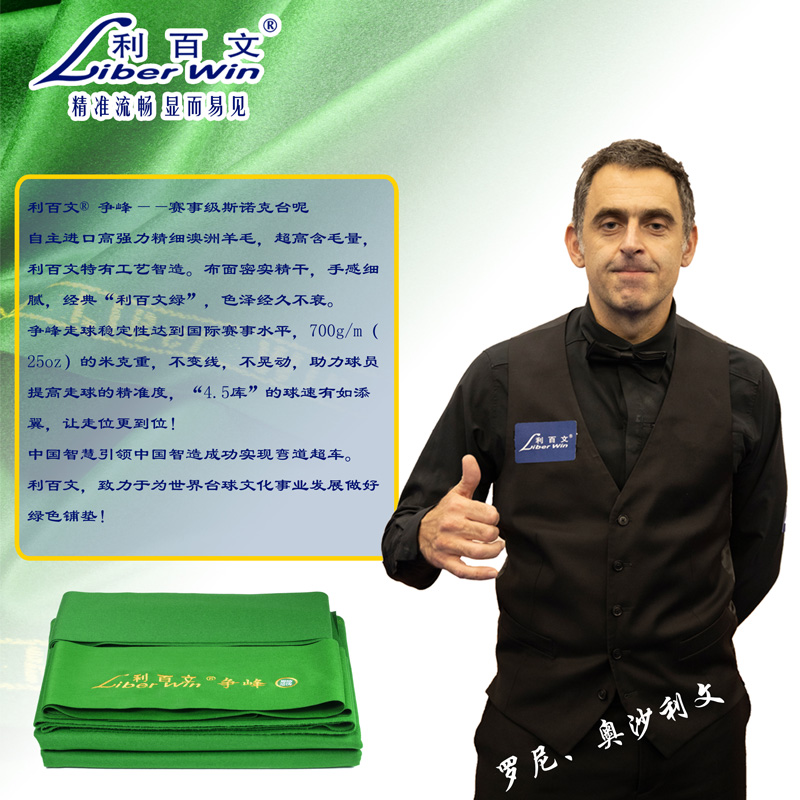 如今,利百文®凭借良好的信誉、优质的产品和稳定雄厚的生产能力,与台球行业头部企业及著名赛事经纪公司进行深度合作,全面启动品牌跃升计划,并正式签约斯诺克世界冠军罗尼·奥沙利文、丁俊晖、马克·塞尔比、卢卡·布雷塞尔为利百文全球推广大使,以及签约中式台球世界冠军郑宇伯、楚秉杰、唐春晓等多位球星为品牌宣传大使。未来,利百文®将秉持初心,以推动产业健康发展为己任、以满足客户个性需求为导向,不断深耕台呢市场,精心打造一把真正的“东方利剑”,打破国外同行的垄断,引领中式台呢走向世界,做一个台呢界的真正王者!